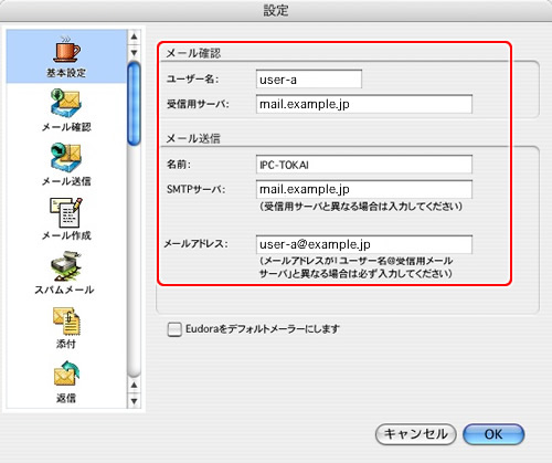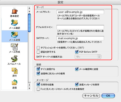 | SMTPサーバ | mail.お客様ドメイン名 (例:mail.example.jp) |