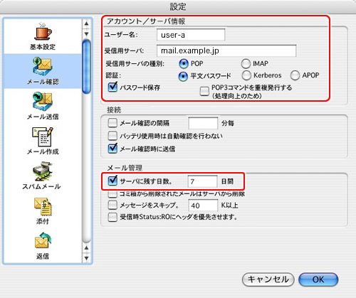 | サーバに残す日数。 | 受信用サーバからメールを受信(ダウンロード)した日より、指定した日数だけメールが受信用サーバに残ります。 日数を入れないと無期限に残りますので、目安として1週間程度、残す設定にしておくと良いでしょう。 |