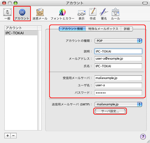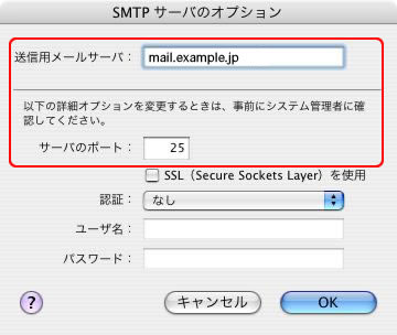 | 送信用メールサーバ | mail.お客様ドメイン名 (例:mail.example.jp) |