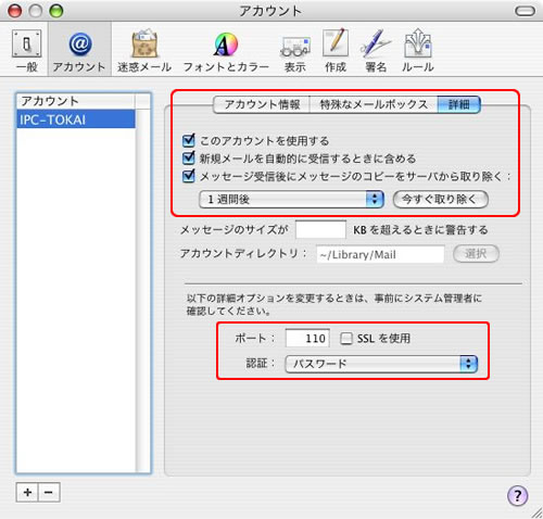 チェックボックスをオンにする [ プルダウンメニュー ]は任意のものを選択 ※チェックボックスをオフにしておくと、サーバ上のメッセージがディスクを圧迫する可能性があります。最悪の場合、メッセージを受信できなくなる場合がありますので、ご注意下さい |