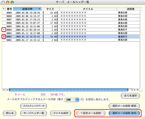 サーバから削除したいメールをクリックして、[選択メール削除 設定]ボタンを押します。選択されると該当メールの先頭に「*」印が付きます。選択が終了したら、[*設定メール削除]ボタンを押します。