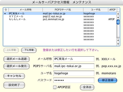 [メールサーバアクセス情報 メンテナンス]ウィンドウが表示されたら上枠のいずれかの行を選択し、以下のように設定して[修正登録]ボタンを押します。その後、[設定終了]ボタンを押してウィンドウを閉じます。