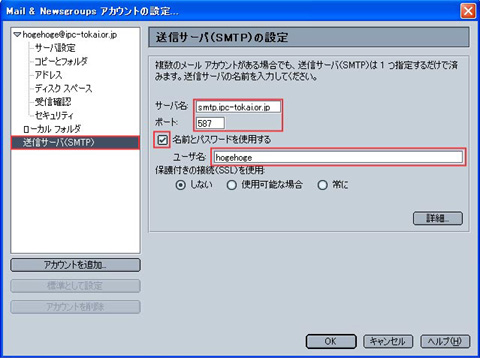 【サーバ名:】 : 【smtp.ipc-tokai.or.jp】を入力します。
