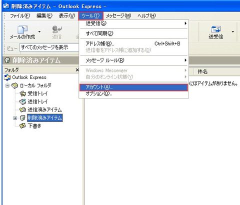 1. OutlookExpressを起動させます。次にOutlookExpressウィンドウ上部にある【ツール(T)】から【アカウント(A)】を左クリックします。