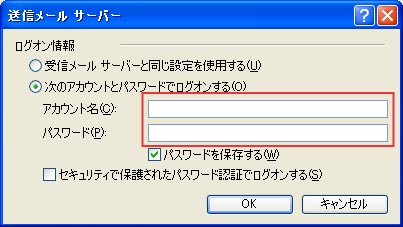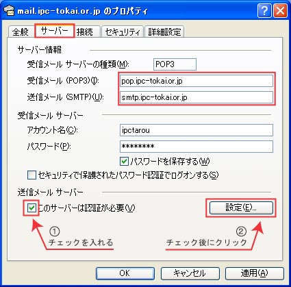 (1)【このサーバーは認証が必要(V):】 : チェックを入れます。