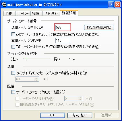 【送信メール(SMTP)(O):】 : 587を入力。