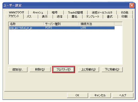 3. ユーザー設定のウィンドウで変更を行いたいユーザーを選択した状態で 【プロバティ(P)】 をクリックしてください。