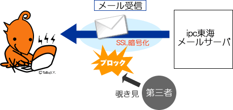 SMTP認証 (Auth-SMTP)「SMTP認証 (Auth-SMTP)」とは、電子メールを送信する際に送信者がIPC東海のユーザーであることを確認するためのシステムです。SMTP認証を採用することによりSPAMメールの中継など、第三者によるメールサーバの不正利用を防ぐことができます。 【詳細】 POP over SSLPOP over SSLとは、メール受信の際にメール内容を暗号化して第三者にメールが読まれる事を防ぐセキュリティ機能です。通常メールデータはネットワークを平文で流れています。そのため悪意を持つ第三者がメールデータを受信できる環境を作ると覗き見する事が可能になってしまいます。そこでメール内容をSSL(Secure Sockets Layer)という方式で暗号化する事で、覗き見を防ぐ事が可能となります。 ![]() 【詳細】 |