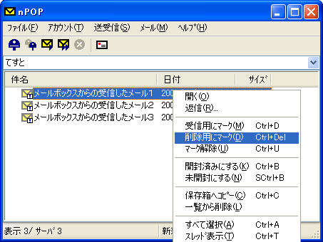削除したいメールを右クリックして「削除用にマーク(D)を選択します」。