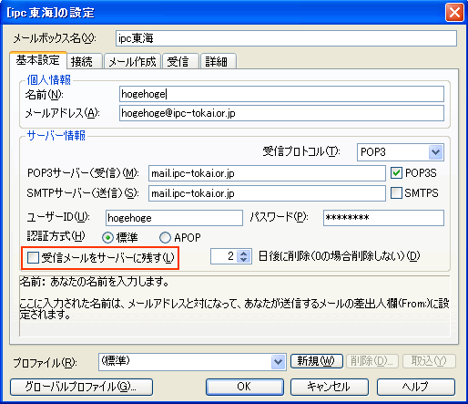 「受信メールをサーバーに残す」